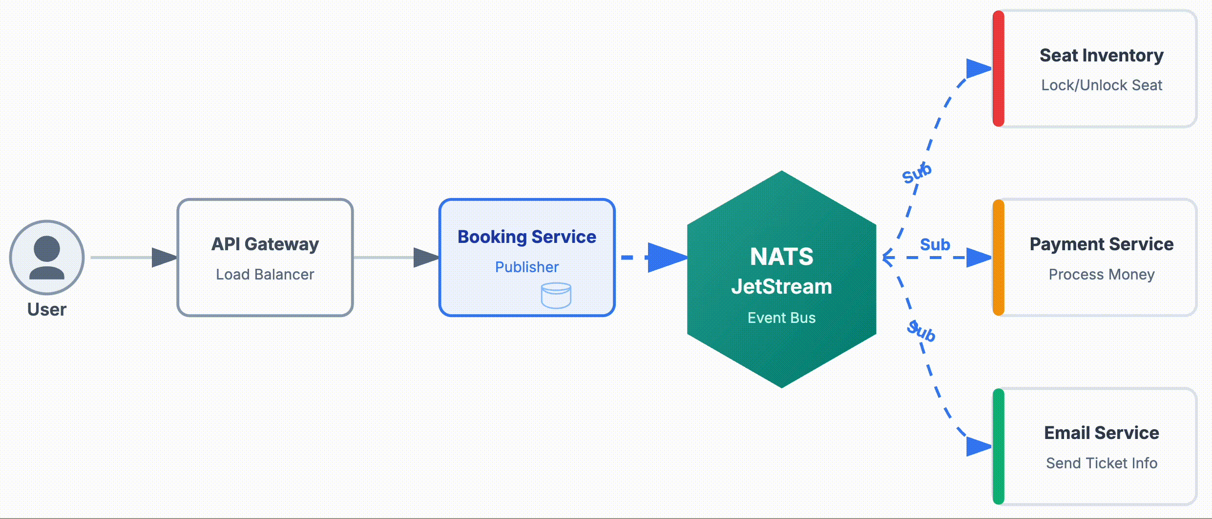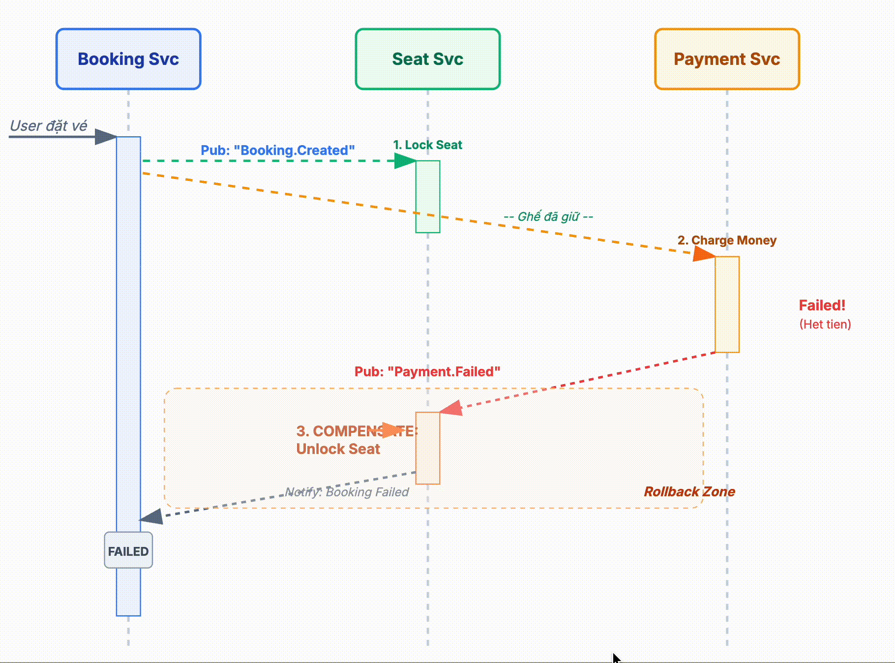BookingCreated. NATS đẩy event này tới Service Seat (để Lock ghế) và Service Payment (để trừ tiền) song song. - Luồng ngược (Compensating Transaction): Phần thú vị nhất. Nếu Service Payment lỗi (ví dụ: thẻ hết hạn, không đủ số dư), nó bắn event