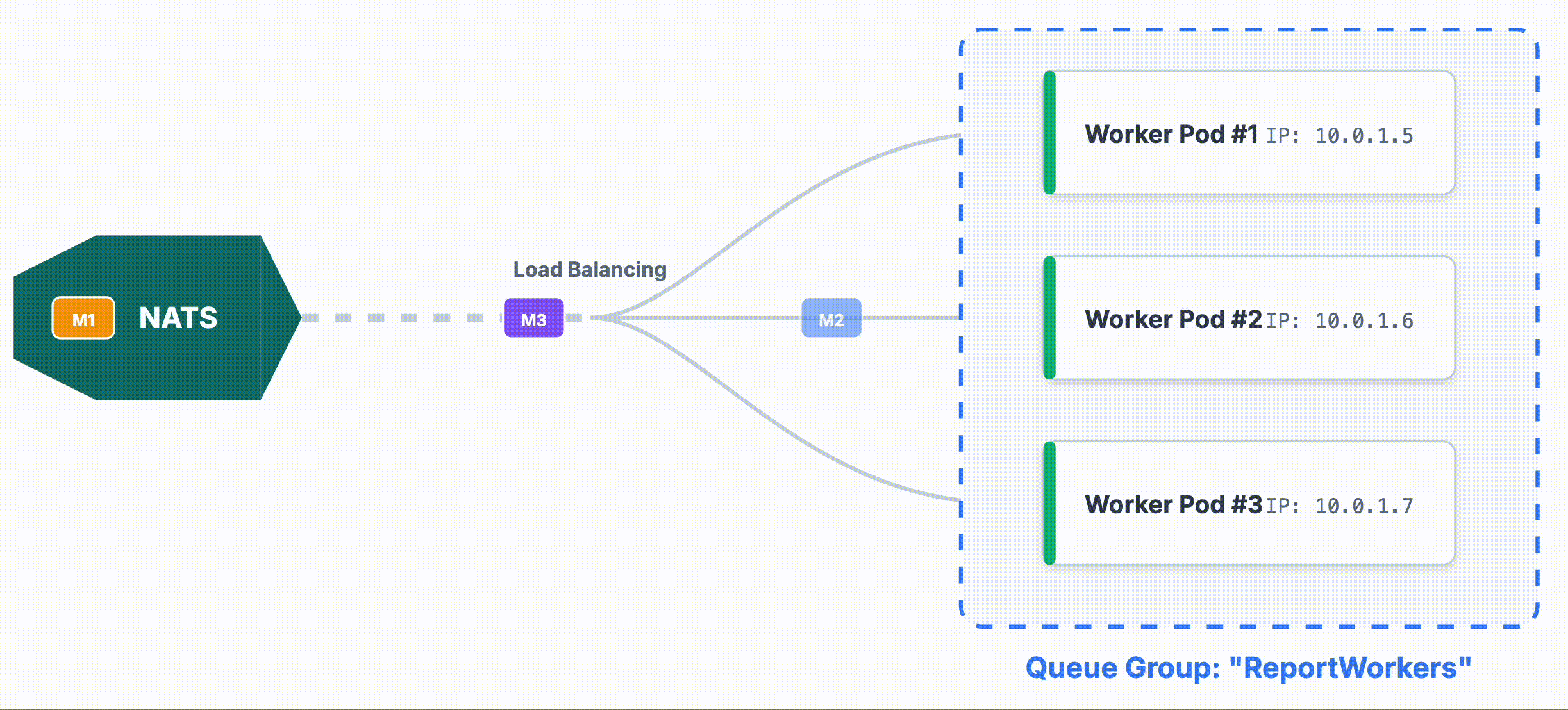 Queue Group đảm bảo message được phân tải đều cho các worker, giúp scale hệ thống chỉ bằng việc khởi tạo thêm instance.