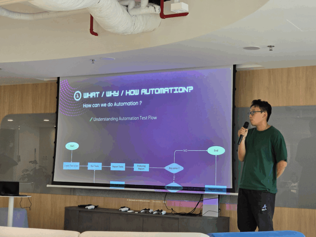 Sau đó, anh Trần Hồ Phi Long mang đến một làn gió mới với buổi seminar về Automation Test, giúp mọi người khám phá sức mạnh của tự động hóa trong kiểm thử phần mềm – một mảnh ghép quan trọng trong quy trình phát triển sản phẩm hiện đại.